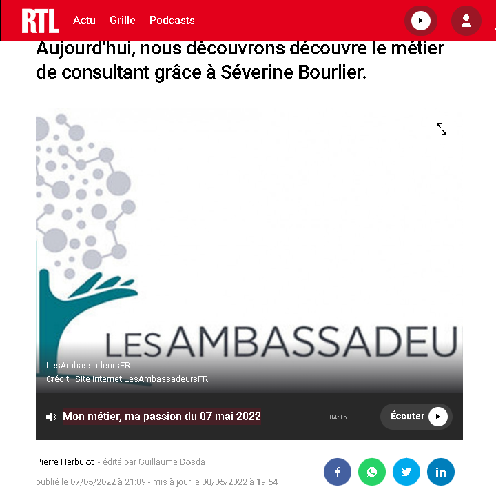 Séverine Bourlier, Présidente de LesAmbassadeursFR, était l’invitée de RTL à l’émission « Mon métier, ma passion » du 07 mai 2022. Une occasion pour parler du métier de consultant. Extrait.